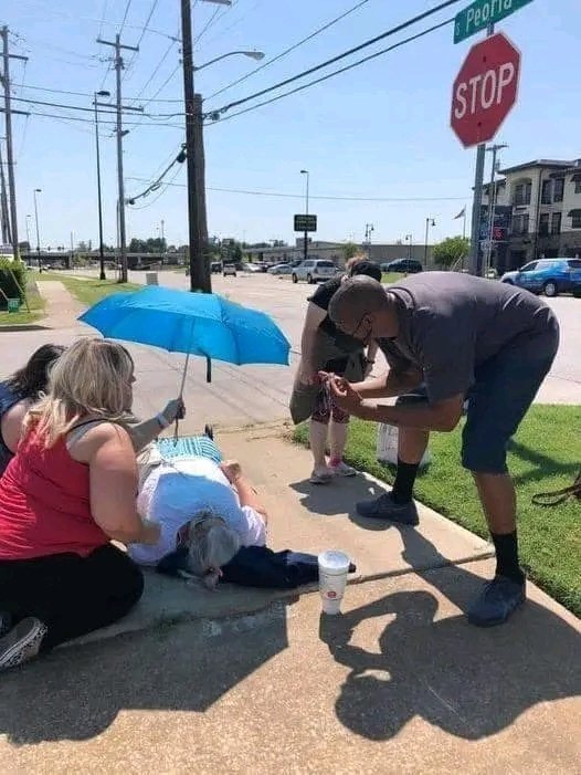 I said I would call for help, and the young Black man went to his car to get a soft jacket and gently placed it under her head to protect her from the scorching heat of the pavement (it was 38°C today). Soon, other kind people arrived.