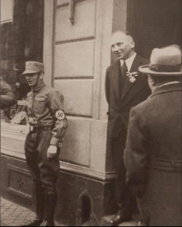 Richard Stern, a Jewish World War I veteran, wears his Iron Cross as a Nazi soldier stands outside his shop trying to intimidate him, 1933.